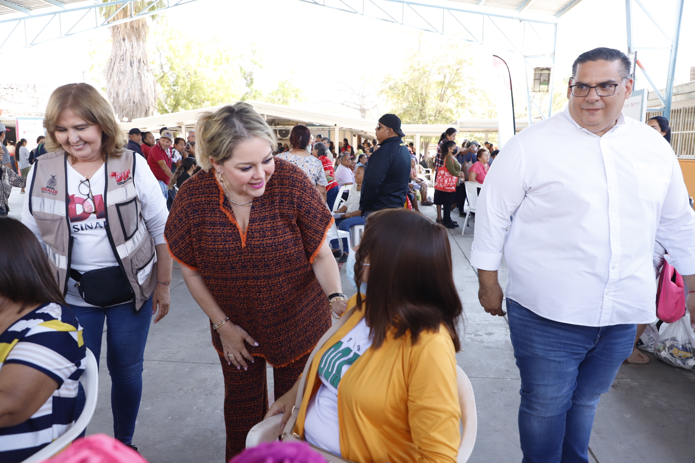 La Presidenta de Sistema DIF Sinaloa, Eneyda Rocha Ruiz, y el Director General de DIF Mazatlán, José Luis Gómez Núñez, reciben a las y los ciudadanos en la Escuela Primaria Democracia, de la colonia Urías