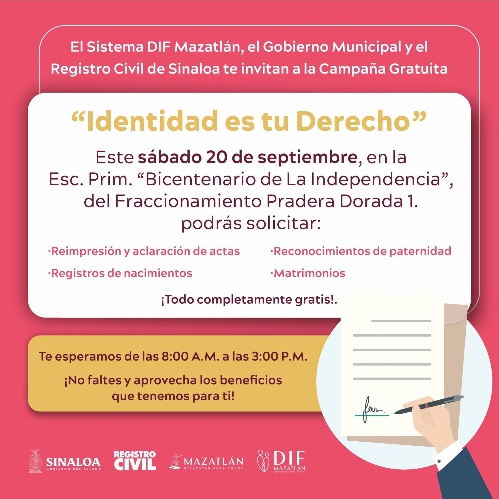 Mazatlán, Sinaloa, 5 de septiembre de 2025.- El Sistema DIF Mazatlán, en coordinación con el Gobierno Municipal, que encabeza la Presidenta Estrella Palacios Domínguez, y el Registro Civil de Sinaloa, invitan a la ciudadanía a participar en la campaña gratuita “Identidad es tu Derecho”.