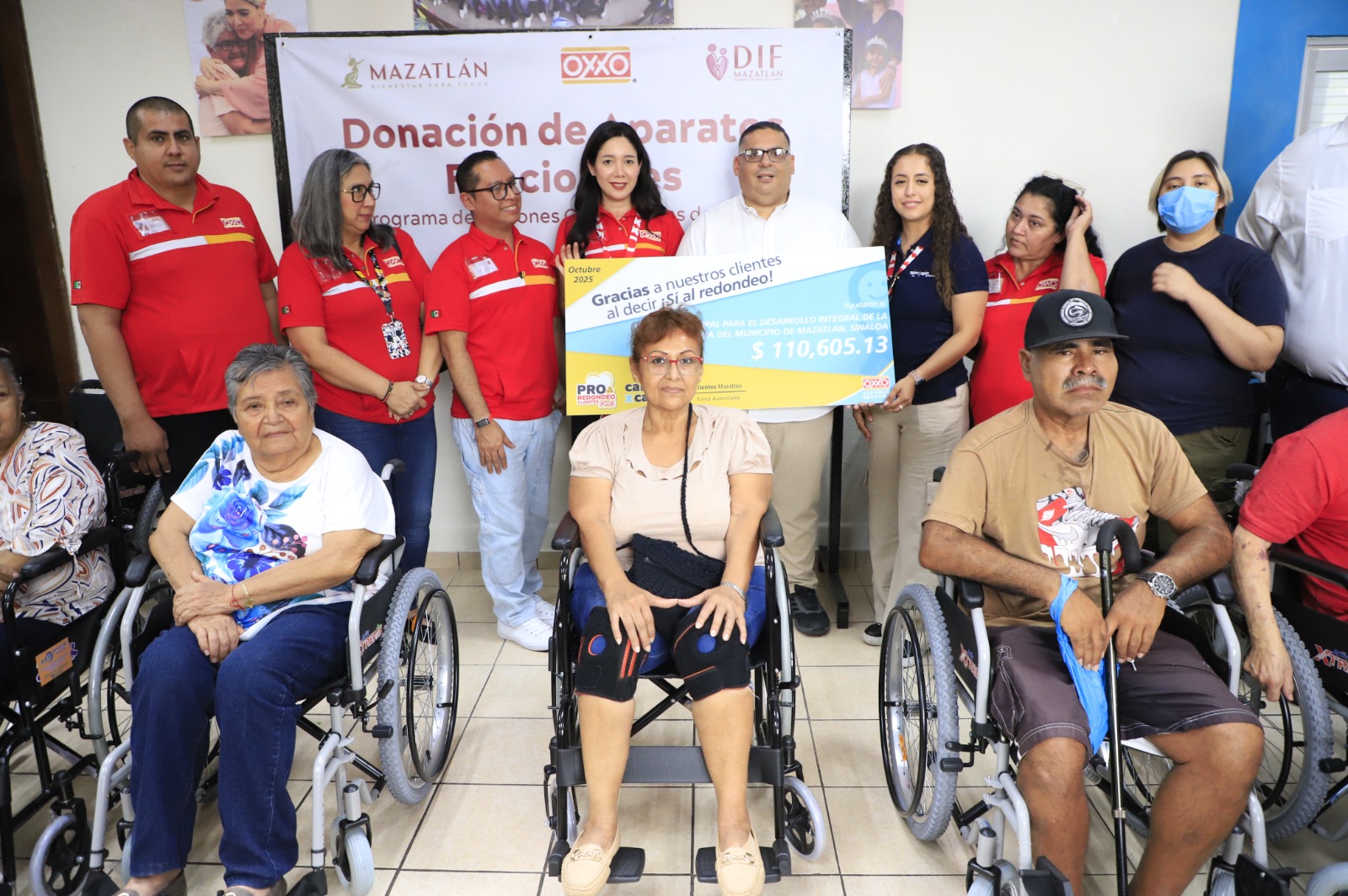 Mazatlán, Sinaloa, 23 de octubre de 2025.– El Sistema DIF Mazatlán y el Gobierno Municipal, que dirige la Presidenta Estrella Palacios Domínguez, realizaron este jueves la entrega de aparatos funcionales como parte del programa Acciones Comunitarias OXXO 2025, toda vez que OXXO entregó un cheque de 110 mil 605 pesos de la aportación del Redondeo OXXO 2025, realizado por los clientes durante los meses de julio, agosto y septiembre del año en curso.